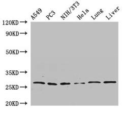 - Positive WB detected in:A549 whole cell lysate,PC3 whole cell lysate,NIH/3T3 whole cell lysate,Hela whole cell lysate,Rat lung tissue,Mouse liver tissue;All lanes:PSMA3 antibody at 2.7?g/ml;Secondary;Goat polyclonal to rabbit IgG at 1/50000 dilution;Predicted band size: 29,28 KDa;Observed band size: 29 KDa;