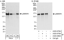 - Detection of human LRRFIP1 by western blot and immunoprecipitation. Samples: Whole cell lysate from HeLa (5, 15 and 50 µg for WB; 1 mg for IP, 20% of IP loaded) and 293T (T; 50 µg) cells. Antibodies: Affinity purified rabbit anti-LRRFIP1 antibody A303-078A used for WB at 0.04 µg/ml (A) and 0.4 µg/ml (B) and used for IP at 6 µg/mg lysate. LRRFIP1 was also immunoprecipitated by rabbit anti-LRRFIP1 antibodies A303-079A and A303-080A, which recognize downstream epitopes. Detection: Chemiluminescence with exposure times of 30 seconds (A) and 1 second (B).