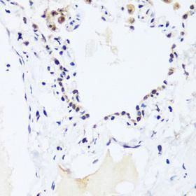 - Immunohistochemistry of paraffin-embedded Human lung using BRIX1 Polyclonal Antibody at dilution of 1:100 (40x lens).