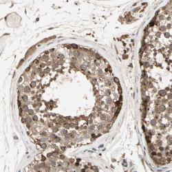 - Immunohistochemical staining of human testis shows distinct cytoplasmic positivity in cells in seminiferus ducts.