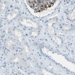 - Immunohistochemical staining of human kidney shows strong cytoplasmic positivity in subsets of glomerular cells.