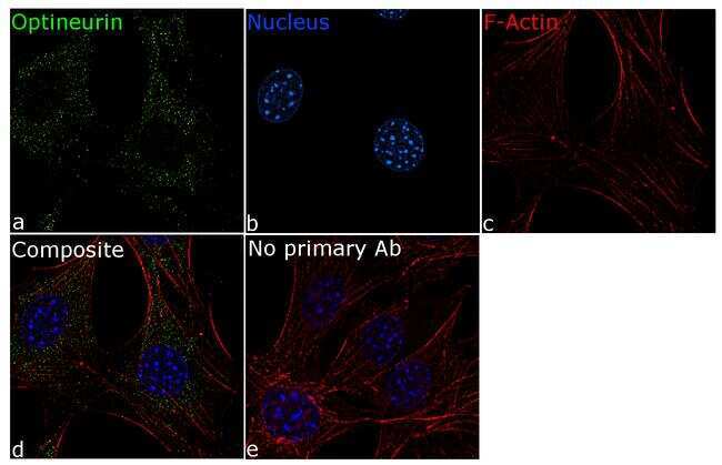 - For immunofluorescence analysis, NIH 3T3 cells were fixed and permeabilized for detection of endogenous Optineurin using Anti- Optineurin Recombinant Rabbit Polyclonal Antibody (Product # 711879, 5 µg/mL) and labeled with Goat anti-Rabbit IgG (H+L) Superclonal™ Secondary Antibody, Alexa Fluor® 488 conjugate (Product # A27034, 1:2000). Panel a) shows representative cells that were stained for detection and localization of Optineurin protein (green), Panel b) is stained for nuclei (blue) using SlowFade® Gold Antifade Mountant with DAPI (Product # S36938). Panel c) represents cytoskeletal F-actin staining using Rhodamine Phalloidin (Product # R415, 1:300). Panel d) is a composite image of Panels a, b and c clearly demonstrating cytoplasmic localization of Optineurin. Panel e) represents control cells without primary antibody to assess background. The images were captured at 60X magnification.