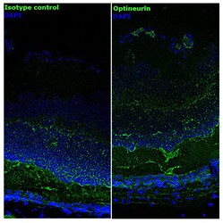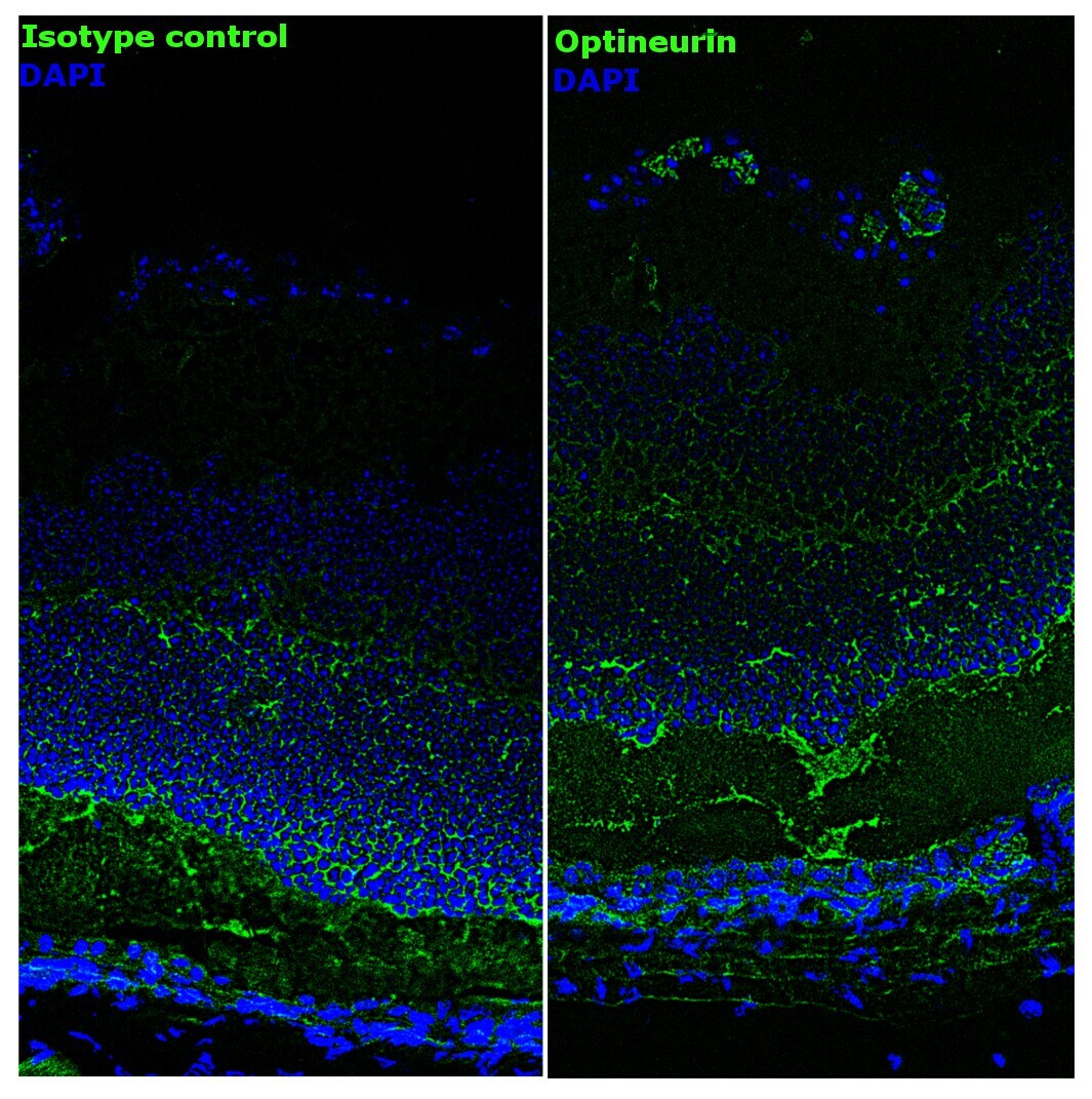 - Immunofluorescence analysis of mouse Retina tissue: Frozen sections were fixed with 4% PFA for 20 min, permeabilized using 0.1% Triton-X 100 for 10 mins and blocked for 1 hour with 2% BSA. Transverse sections of mouse Retina were incubated with Anti-Optineurin Recombinant Rabbit Superclonal™ Antibody (Product # 711879, 1:250 dilution) overnight at 4°C, followed by Goat anti-Rabbit IgG (Heavy Chain) Superclonal™ Secondary Antibody, Alexa Fluor® 488 conjugate (Product # A27034, 1:2000, 45 mins). Nuclei (blue) were stained using SlowFade® Gold Antifade Mountant with DAPI (Product # S36938), Panel a) represents staining with the matched isotype control. Panel b) shows a representative mouse retinal section stained for Optineurin (green). The images were captured at 20X magnification.