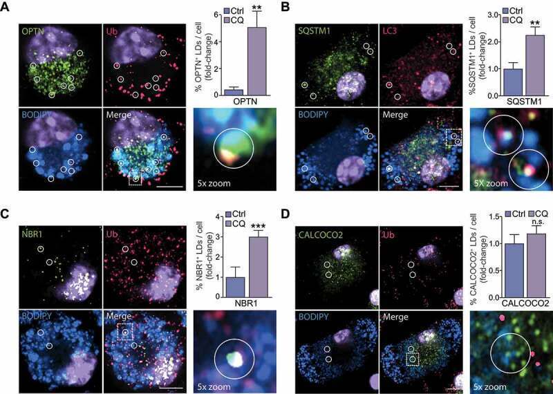 - Figure 4. Selective autophagy receptors (SARs) OPTN, NBR1 and SQSTM1 selectively localize to foam cell lipid droplets (LDs). (A-D) Immunostaining for OPTN (A), SQSTM1 (B), NBR1 (C) or CALCOCO2 (D) in agLDL-loaded mouse bone marrow-derived macrophage foam cells stained with BODIPY 493/503 to label LD neutral lipids, with areas of interest circled. At right, quantification of the percent of cellular LDs tagged with SARs in chloroquine-treated cells (CQ) as compared to control (Ctrl) is shown. Data are expressed as fold-change for the chloroquine treatment relative to untreated from one experiment representative of 3 independent experiments with similar results (mean +- s.e.m). ** P < 0.005, *** P < 0.0005. Representative images are from CQ-treated cells. Scale bar: 5 mum