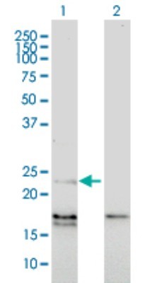 - Western Blot: Endothelin-1 Antibody (3D6) [H00001906-M01] - Analysis of EDN1 expression in transfected 293T cell line by EDN1 monoclonal antibody (M01), clone 3D6.Lane 1: EDN1 transfected lysate(24 KDa).Lane 2: Non-transfected lysate.