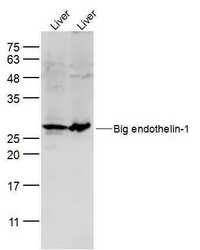 - Lane 1: mouse liver lysates; Lane 2: rat liver lysates probed with Preproendothelin 1 Polyclonal Antibody, Unconjugated (bs-0188R) at 1:300 dilution and 4°C overnight incubation. Followed by conjugated secondary antibody incubation at 1:10000 for 60 min at 37°C.