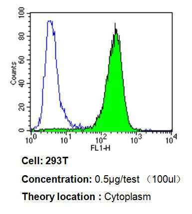 - Flow cytometry analysis of Endothelin 1 in 293T cells compared to an isotype control (blue). Cells were harvested, adjusted to a concentration of 1-5x10^6 cells/mL, fixed with 2% paraformaldehyde, washed with PBS, and incubated with Endothelin 1 monoclonal antibody (Product # MA3-005) at a dilution of 0.5 µg/test for 60 min at room temperature. Cells were then blocked in a solution of 2% BSA-PBS for 30 min at room temperature, incubated for 40 min at room temperature in the dark using a Dylight 488-conjugated goat anti-mouse IgG (H+L) secondary antibody, and re-suspended in PBS for FACS analysis.