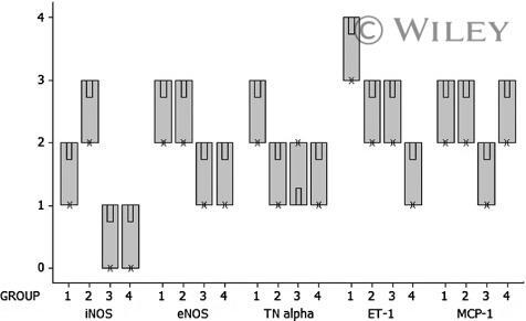 - 2 Staining intensities of endothelial cells. Boxplot graphic of iNOS, eNOS, TNF-alpha and ET-1 and MCP-1. Group 1, OVX; Group 2, OVX+RL; Group 3, OVX+AV; Group 4, OVX+RL+AV. Data are presented as median. Kruskal-Wallis test was performed to determine the differences between groups.