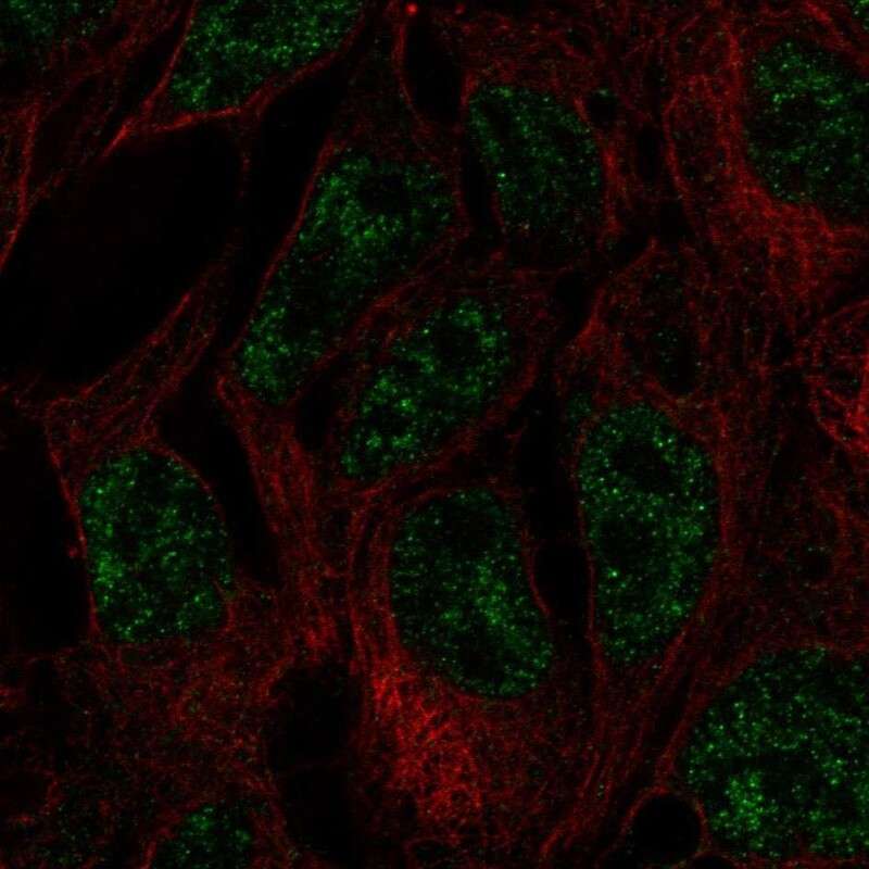 - Immunofluorescent staining of human cell line CACO-2 shows localization to nuclear speckles.