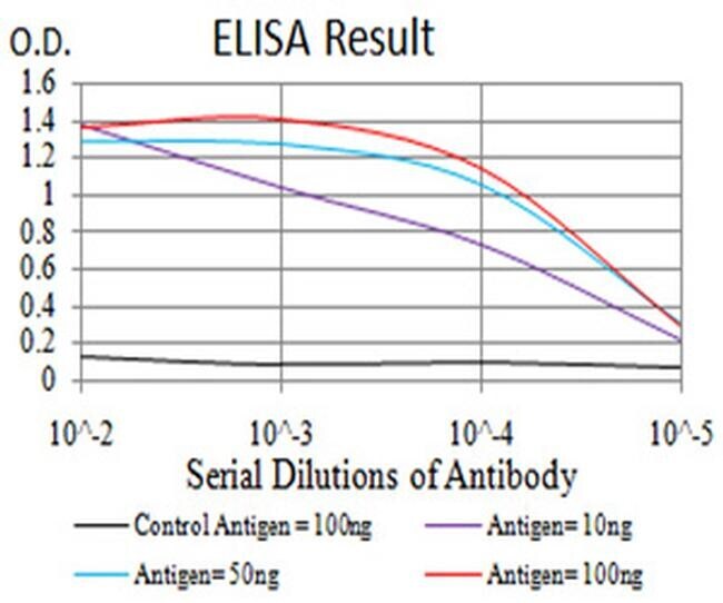 - ELISA analysis of DNMT3L in Control Antigen (black line, 100 ng); Antigen (purple line, 10 ng); Antigen (blue line, 50 ng); Antigen (red line, 100 ng). Samples were incubated with DNMT3L monoclonal antibody (Product # MA5-31722) using a dilution of 1:10,000.