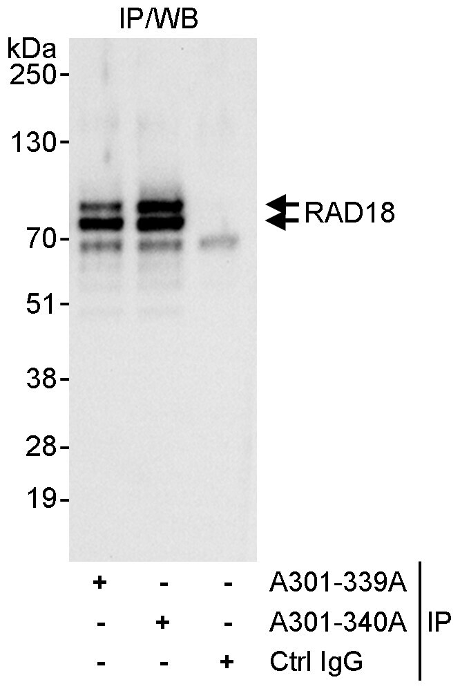 - Detection of human RAD18 by western blot of immunoprecipitates. Samples: Whole cell lysate (1 mg for IP, 20% of IP loaded) from HeLa cells. Antibodies: Affinity purified rabbit anti-RAD18 antibody A301-339A used for IP at 3 µg/mg lysate. RAD18 was also immunoprecipitated by rabbit anti-RAD18 antibody A301-340A, which recognizes a downstream epitope. For blotting immunoprecipitated RAD18, A301-340A was used at 1 µg/ml. Detection: Chemiluminescence with an exposure time of 3 seconds.