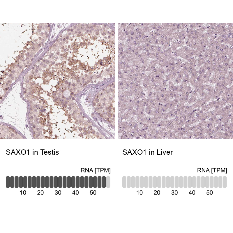 - Immunohistochemistry analysis in human testis and liver tissues using HPA023899 antibody. Corresponding SAXO1 RNA-seq data are presented for the same tissues.