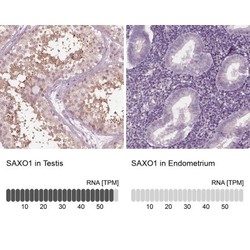 - Immunohistochemistry-Paraffin: FAM154A Antibody [NBP1-86710] - Staining in human testis and endometrium tissues using anti-SAXO1 antibody. Corresponding SAXO1 RNA-seq data are presented for the same tissues.