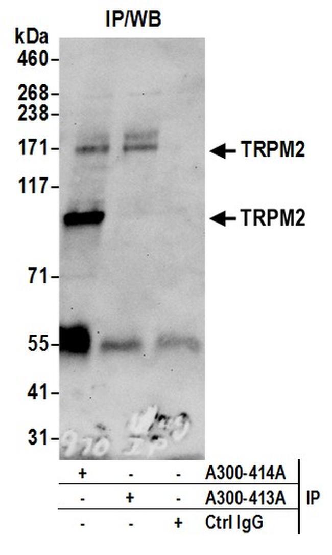 - Detection of human TRPM2 by western blot of immunoprecipitates. Samples: Membrane Prep (0.5 or 1.0 mg per IP reaction; 20% of IP loaded) from Jurkat cells. Antibodies: Affinity purified rabbit anti-TRPM2 antibody A300-414A (lot A300-414A-3) used for IP at 6 µg per reaction. TRPM2 was also immunoprecipitated by rabbit anti-TRPM2 antibody A300-413A. For blotting immunoprecipitated TRPM2, A300-414A was used at 1 µg/ml. Detection: Chemiluminescence with an exposure time of 30 seconds.