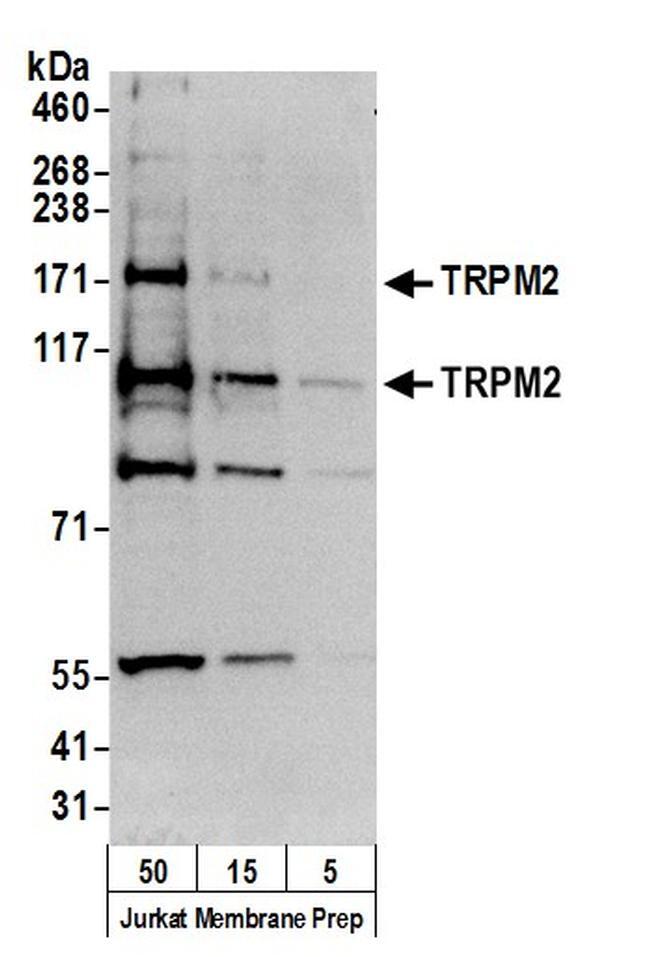 - Detection of human TRPM2 by western blot. Samples: Jurkat Membrane Prep (50, 15, 5 µg). Antibody: Affinity purified rabbit anti-TRPM2 antibody A300-414A (lot A300-414A-3) used for WB at 0.1 µg/ml. Detection: Chemiluminescence with an exposure time of 3 minutes.