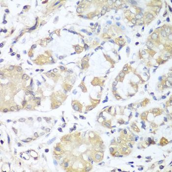 - Immunohistochemistry of paraffin-embedded human stomach using RPH3AL antibody at dilution of 1:100 (40x lens).