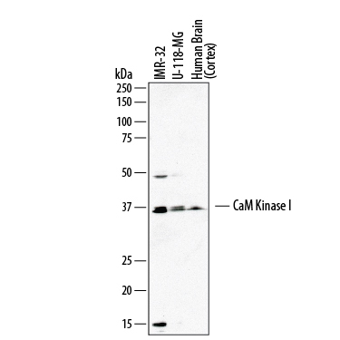 - Detection of Human CaM Kinase I by Western Blot. Western blot shows lysates of IMR-32 human neuroblastoma cell line, U-118-MG human glioblastoma/astrocytoma cell line, and human brain (cortex) tissue. PVDF membrane was probed with 2 µg/mL of Sheep Anti-Human CaM Kinase I Antigen Affinity-purified Polyclonal Antibody (Catalog # AF7899) followed by HRP-conjugated Anti-Sheep IgG Secondary Antibody (Catalog # HAF016). A specific band was detected for CaM Kinase I at approximately 37 kDa (as indicated). This experiment was conducted under reducing conditions and using Immunoblot Buffer Group 1.