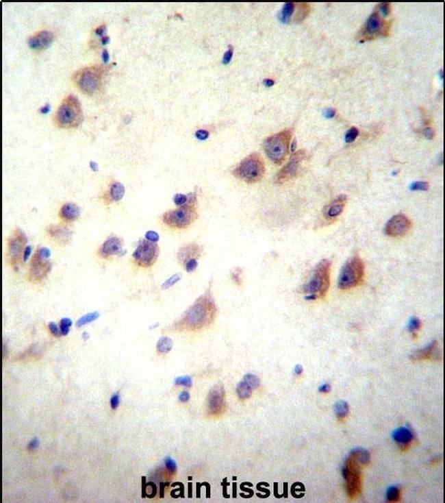 - Immunohistochemical analysis of GRIN3B in paraffin-embedded human brain tissue. Samples were incubated with GRIN3B polyclonal antibody (Product # PA5-71669) followed by a peroxidase-conjugate secondary antibody and DAB staining.