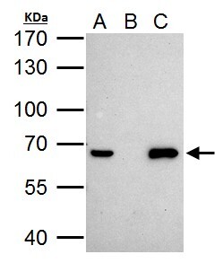 - NRB1 antibody immunoprecipitates NRB1 protein in IP experiments. IP Sample: HeLa whole cell lysate/extract A. 40 ug HeLa whole cell lysate/extract B. Control with 2 ug of preimmune rabbit IgG C. Immunoprecipitation of NRB1 protein by 2 ug of NRB1 antibody 7.5% SDS-PAGE The immunoprecipitated NRB1 protein was detected by NRB1 antibody diluted at 1:1000. EasyBlot anti-rabbit IgG (anti-rabbit IgG (HRP) -01) was used as a secondary reagent.