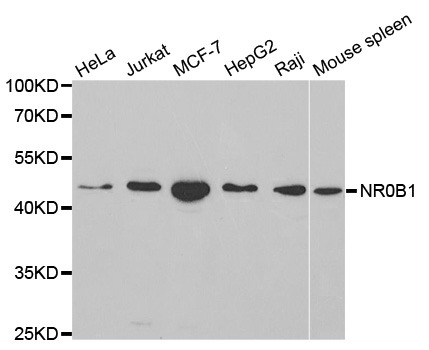 - Western blot analysis of extracts of various cell lines, using NR0B1 antibody.