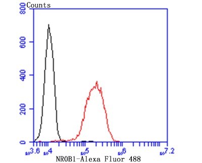 - Flow Cytometry: DAX1/NR0B1 Antibody (JU33-05) [NBP2-75462] - Analysis of A549 cells with NR0B1 antibody at 1/100 dilution (red) compared with an unlabelled control (cells without incubation with primary antibody; black). Alexa Fluor 488-conjugated goat anti-rabbit IgG was used as the secondary antibody.