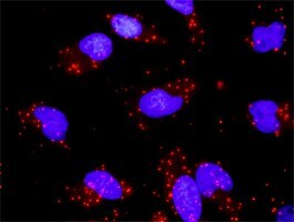 - Proximity Ligation Analysis of protein-protein interactions between DUSP4 and MAPK9. HeLa cells were stained with anti-DUSP4 rabbit purified polyclonal 1:1200 and anti-MAPK9 mouse monoclonal antibody 1:50. Each red dot represents the detection of protein-protein interaction complex, and nuclei were counterstained with DAPI (blue).