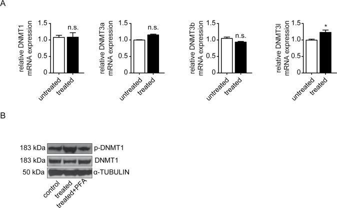 - Fig 4 High Pi influences HCAEC mediated by increased DNMT1 activity. Cells were treated with Pi 3mM for 72 hours. (A) qRT-PCR data showing the mRNA expression of DNA methyltransferases (DNMT1, DNMT3a, DNMT3b and DNMT3l) in control and Pi treated cells. (B) Western blot demonstrating the enhanced protein level in phosphorylated DNMT1-ser154 stimulated by Pi treatment, which was inhibited by phosphate transporter inhibitor Phosphonoformic Acid (PFA), whereas total DNMT1 was not affected.