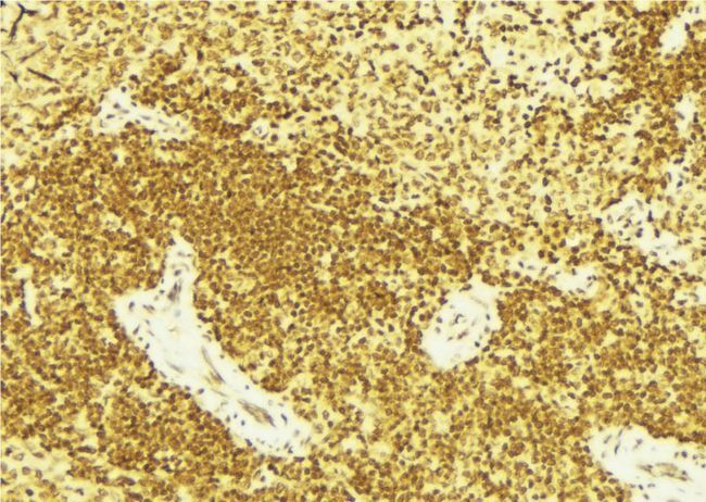 - 1:100 staining mouse spleen tissue by IHC-P. The sample was formaldehyde fixed and a heat mediated antigen retrieval step in citrate buffer was performed. The sample was then blocked and incubated with the antibody for 1.5 hours at 22°C. An HRP conjugated goat anti-rabbit antibody was used as the secondary.