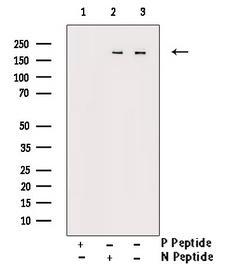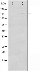 - Western blot analysis of Phospho-FANCD2 (Ser222) antibody expression in CalyculinA treated HT29 cells lysates. The lane on the right is treated with the antigen-specific peptide.