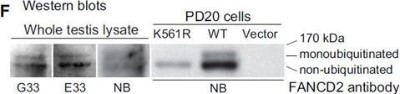 - Western Blot: FANCD2 Antibody [NB100-182] - The FA-BRCA Pathway Is Activated on the Sex Chromosomes during Meiosis. Schematic of the FA-BRCA pathway. FA proteins analyzed in this study are shown in color. Western blot analysis with three independent anti-FANCD2 antibodies (G33, E33, and Novus NB100-182 antibody: NB). K561R, PD20 cells expressing a mutated form of FANCD2 incapable of monoubiquitination; WT, PD20 cells complemented with wild-type FANCD2; Vector, PD20 cells containing empty vector. Image collected and cropped by CiteAb from the following publication (http://linkinghub.elsevier.com/retrieve/pii/S2211124716313298), licensed under a CC-BY licence.