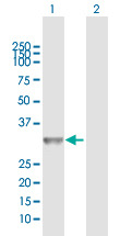 - Western Blot analysis of CCND2 expression in transfected 293T cell line (H00000894-T02) by CCND2 MaxPab polyclonal antibody.Lane 1: CCND2 transfected lysate(33.10 KDa).Lane 2: Non-transfected lysate.