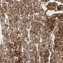 - Immunohistochemical staining of human heart muscle shows strong membranous positivity in myocytes.