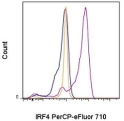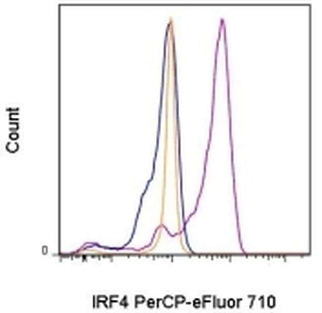 - Intracellular staining of 3-day Anti-Human CD3 and Anti-Human CD28 Functional Grade Purified (Product # 16-0031-82 and Product # 16-0281-82)-stimulated human peripheral blood cells with 0.125 µg of Rat IgG1 K Isotype Control PerCP-eFluor® 710 (Product # 46-4301-80) (blue histogram) or 0.125 µg of Anti-Human/Mouse IRF4 PerCP-eFluor® 710 (purple histogram). The orange histogram is unstimulated cells stained with 0.125 µg of Anti-Human/Mouse IRF4 PerCP-eFluor® 710. Viable lymphocytes, as determined by Fixable Viability Dye eFluor® 780, were used for analysis.