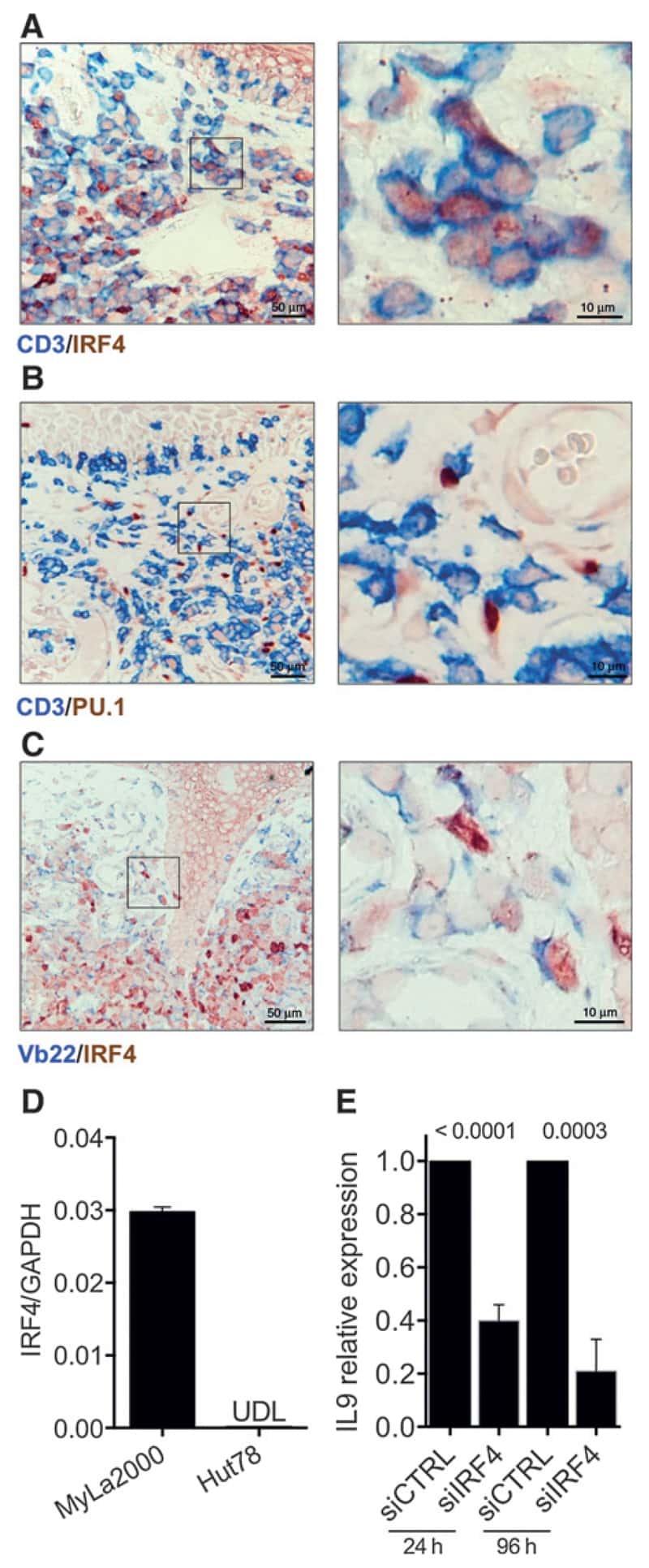 - Description: The monoclonal antibody 3E4 reacts with human and mouse interferon regulatory factor 4 (IRF4). IRF4 is a 52 kDa transcription factor with roles in B cell, T cell and macrophage function. In B cells, IRF4 is highly expressed in mature plasma cells and plays a crucial role in their differentiation. IRF4 has been shown to interact with PU.1 and control the transcription of many B cell-specific genes including Prdm1, which encodes Blimp1. In T cells, IRF4 has been implicated in regulatory T (Treg), Th2, Th9 and Th17 cell development and function. This transcription factor is upregulated upon T cell activation and is expressed in mature T cells. Studies have shown that IRF4 directly induces Blimp1 expression in Tregs, leading to IL-10 expression. IRF4 has also been demonstrated to be involved in macrophage polarization and regulation. Lastly, in addition to its roles in normal immune function, IRF4 expression has been reported to be upregulated in many blood-related cancers. Applications Reported:This 3E4 antibody has been reported for use in intracellular staining followed by flow cytometric analysis. Applications Tested: This 3E4 antibody has been tested by intracellular staining and flow cytometric analysis of stimulated normal human peripheral blood cells using the Foxp3/Transcription Factor Buffer Set