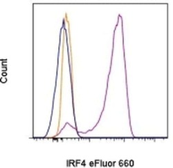 - Intracellular staining of 3-day Anti-Human CD3 and Anti-Human CD28 Functional Grade Purified (Product # 16-0031-82 and Product # 16-0281-82)-stimulated human peripheral blood cells with 0.125 µg of Rat IgG1 K Isotype Control eFluor® 660 (Product # 50-4301-82) (blue histogram) or 0.125 µg of Anti-Human/Mouse IRF4 eFluor® 660 (purple histogram). The orange histogram is unstimulated cells stained with 0.125 µg of Anti-Human/Mouse IRF4 eFluor® 660. Viable lymphocytes, as determined by Fixable Viability Dye eFluor® 450 (Product # 65-0863-14), were used for analysis.