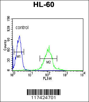 - IRF8 Antibody (C-term) flow cytometric analysis of HL-60 cells (right histogram) compared to a negative control cell (left histogram).FITC-conjugated goat-anti-rabbit secondary antibodies were used for the analysis.