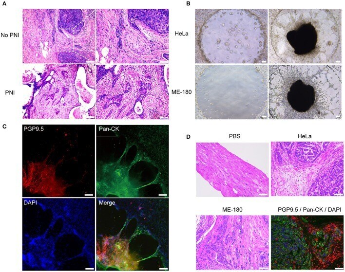 - Figure 1 The presence of perineural invasion in vitro and in vivo . (A) Hematoxylin and eosin (HE) stained image of non-PNI and PNI cervical cancer tissues. The area of nerves is marked by a dashed line. N refers to nerves and C refers to cancer cells. (B) Cervical cancer cell lines, HeLa and ME-180, induced PNI in an in vitro model. DRG was placed in the center of Matrigel (50x magnification, scale bar, 100 mum). (C) Double immunofluorescence staining of neurites and HeLa cells in the perineural niche. Staining: PGP9.5, pan-cytokeratin (pan-CK), DAPI, and overlay respectively (100x magnification, scale bar, 100 mum). (D) H&E stained image of sciatic nerves injected with PBS, HeLa and ME-180, respectively. Image in the right refers to double immunofluorescence staining of sciatic nerve (PGP9.5) and HeLa cells (pan-CK) (200x magnification, scale bar, 50 mum).