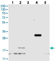 - Western blot analysis of Lane 1: RT-4, Lane 2: U-251 MG, Lane 3: Human Plasma, Lane 4: Liver, Lane 5: Tonsil with C21orf57 polyclonal antibody (Cat # PAB21159).