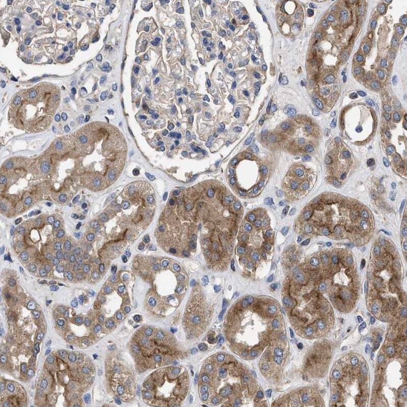 - Immunohistochemical analysis of YBEY in human kidney using YBEY Polyclonal Antibody (Product # PA5-53745) shows moderate cytoplasmic positivity in cells in tubules.