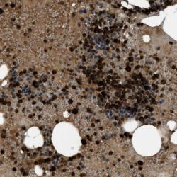- Immunohistochemical staining of human bone marrow shows strong cytoplasmic positivity in bone marrow poietic cells.