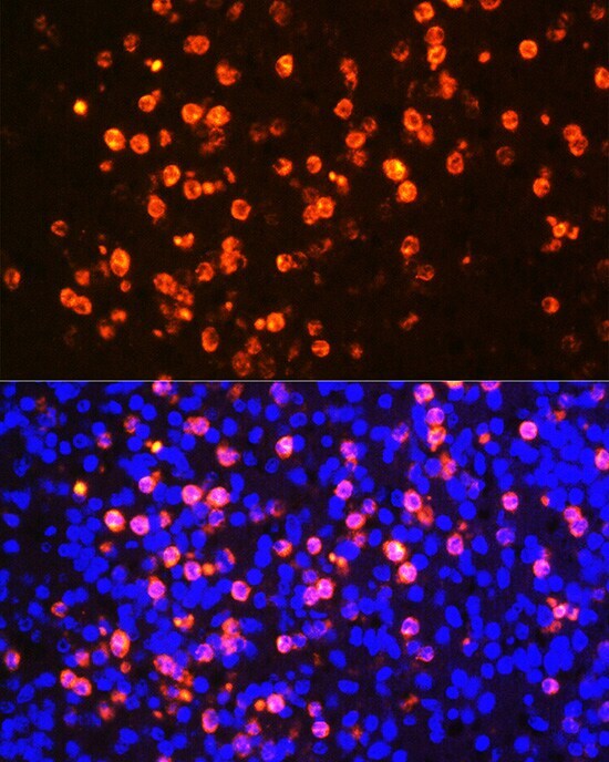 - Immunohistochemistry (Immunofluorescence) analysis of PR3 in human spleen. Samples were incubated with PR3 Monoclonal antibody (Product # MA5-42734) using a dilution of 1:100 (40x lens). Blue: DAPI for nuclear staining.