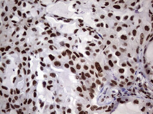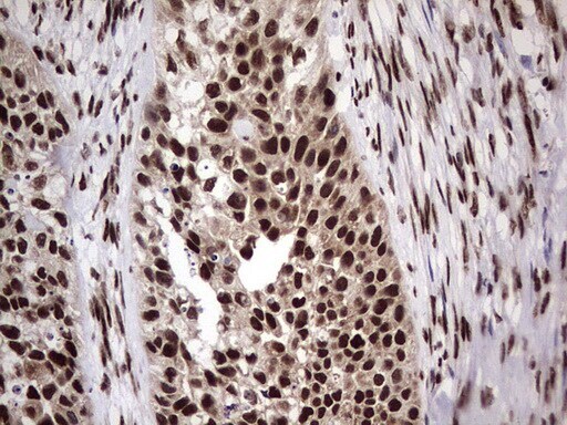 - Immunohistochemical staining of paraffin-embedded Carcinoma of Human lung tissue using anti-RTRAF mouse monoclonal antibody. (Heat-induced epitope retrieval by 1 mM EDTA in 10mM Tris, pH8.5, 120°C for 3min, TA804058)