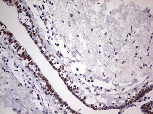 - Immunohistochemical staining of paraffin-embedded Adenocarcinoma of Human breast tissue using anti-RTRAF mouse monoclonal antibody. (Heat-induced epitope retrieval by 1 mM EDTA in 10mM Tris, pH8.5, 120°C for 3min, TA804058)