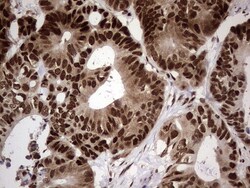 - Immunohistochemical staining of paraffin-embedded Adenocarcinoma of Human colon tissue using anti-RTRAF mouse monoclonal antibody. (Heat-induced epitope retrieval by 1 mM EDTA in 10mM Tris, pH8.5, 120°C for 3min, TA804058)