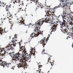 - Immunohistochemical staining of human bone marrow shows strong nuclear positivity in a subset of bone marrow poietic cells.