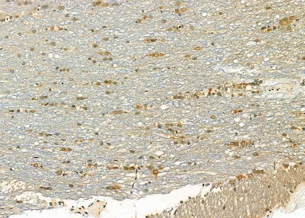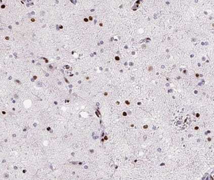 - Immunohistochemistry analysis of paraffin-embedded MED14 in human brain tissue sections. Antigen retrieval was performed using citrate buffer. Samples were blocked with blocking buffer (1.5 hr, 22°C), incubated with MED14 polyclonal antibody (Product # PA5-99205) using a dilution of 1:100 (1.5 hr, 22°C), followed by HRP conjugated goat anti-rabbit.