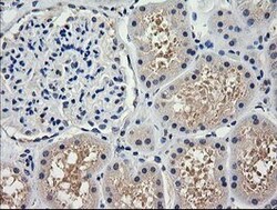 - Immunohistochemical staining of paraffin-embedded human Kidney tissue within the normal limits using anti-TRIM38 mouse monoclonal antibody. (Heat-induced epitope retrieval by 10mM citric buffer, pH6.0, 120°C for 3min, TA505963)