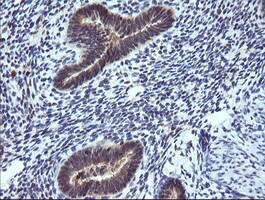 - Immunohistochemical staining of paraffin-embedded human endometrium tissue within the normal limits using anti-TRIM38 mouse monoclonal antibody. (Heat-induced epitope retrieval by 10mM citric buffer, pH6.0, 120°C for 3min, TA505979)