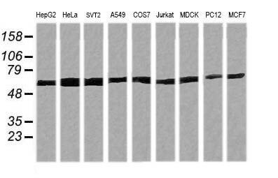 - Western blot analysis of extracts (35 µg) from 9 different cell lines by using anti-TRIM38 monoclonal antibody (HepG2: human; HeLa: human; SVT2: mouse; A549: human; COS7: monkey; Jurkat: human; MDCK: canine; PC12: rat; MCF7: human).