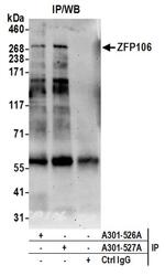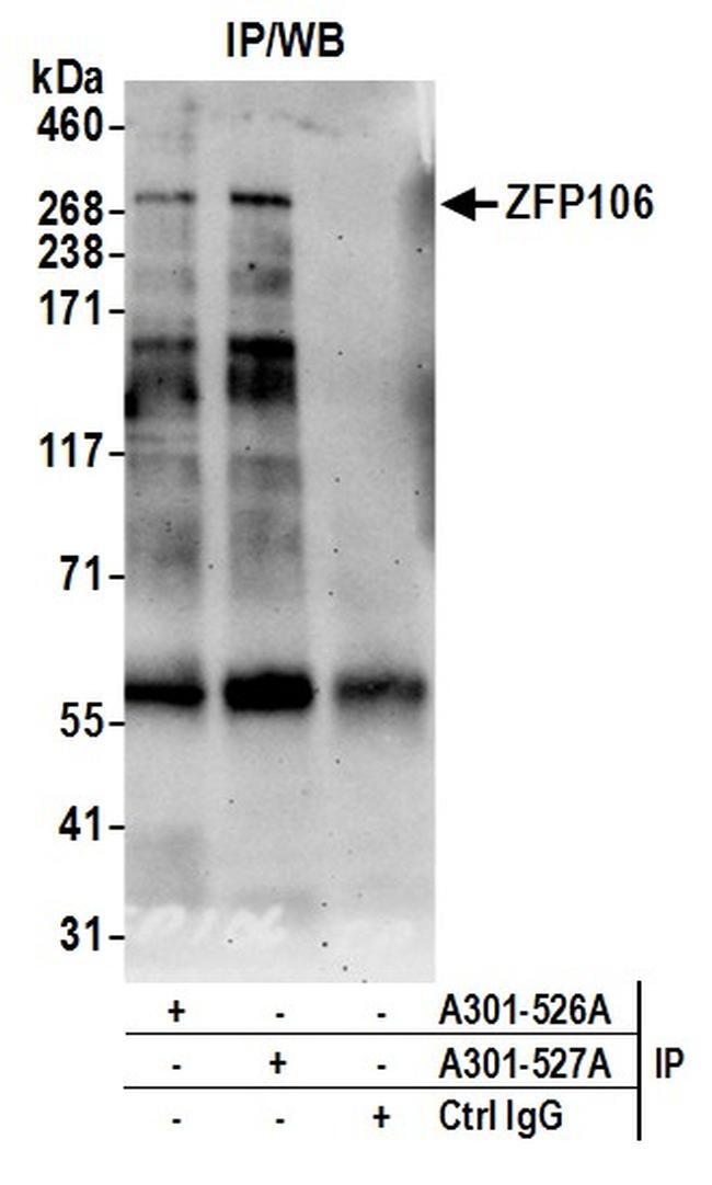 - Detection of human ZFP106 by western blot of immunoprecipitates. Samples: Nuclear Extract (0.5 or 1.0 mg per IP reaction; 20% of IP loaded) from 293T cells. Antibodies: Affinity purified rabbit anti-ZFP106 antibody A301-527A (lot A301-527A-2) used for IP at 6 µg per reaction. ZFP106 was also immunoprecipitated by rabbit anti-ZFP106 antibody A301-526A. For blotting immunoprecipitated ZFP106, A301-527A was used at 1 µg/ml. Detection: Chemiluminescence with an exposure time of 75 seconds.